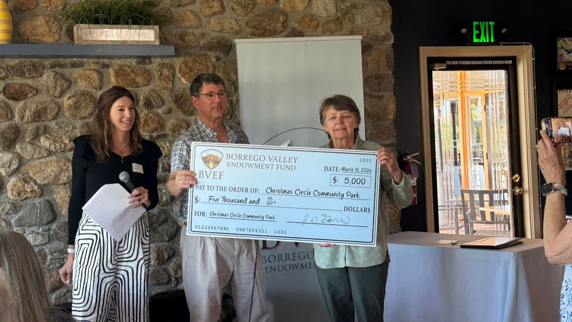 The Borrego Valley Endowment Fund held its annual Grant Awards Luncheon on Wednesday, March 18, 2026, at Coyote Steakhouse at The Palms at Indianhead in Borrego Springs. The event recognized local nonprofit organizations receiving support for healthcare, education, arts, and community programs. Sue Bosworth accepted the award on behalf of the Christmas Circle Community Park board, which shared the following statement: